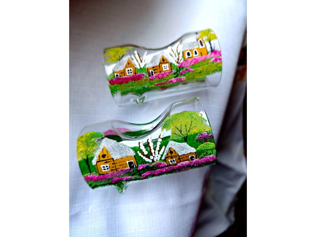 Ručně malovaný skleněný svícen na jednu čajovou svíčku z českého skla. Jemný motiv domečků a stromů vynikne krásně při rozsvícení svíček. Každý kus je originál malovaný s láskou. Ideální na večerní pohodu, sváteční stůl nebo jako milý dárek. Každý kus je originál – drobné rozdíly v barvě, velikosti či rozložení motivu jsou přirozenou součástí ruční práce a dělají z každého svícnu jedinečný kousek.