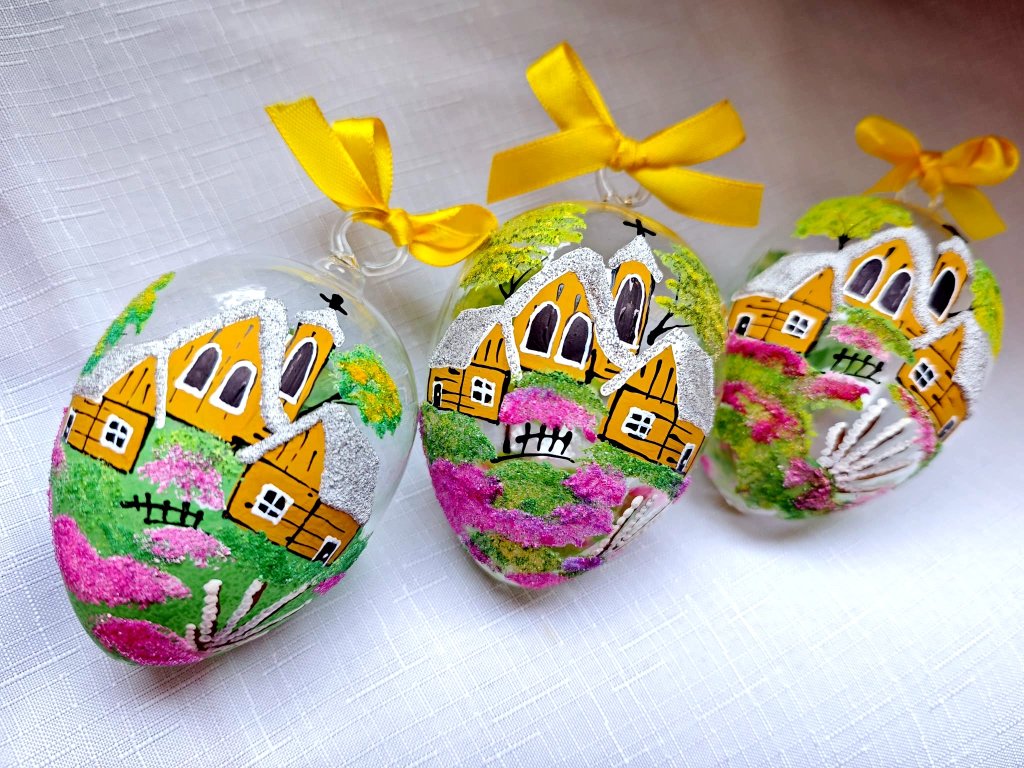Tradiční jarní motiv v moderním pojetí. Ručně malované skleněné vajíčko z českého skla s domečky, stromečky a jemnými detaily. Každý kus vzniká ručně, proto se může lehce lišit v barvách, velikosti i malbě – žádné vajíčko není stejné. Ideální jako velikonoční dekorace nebo milý dárek.